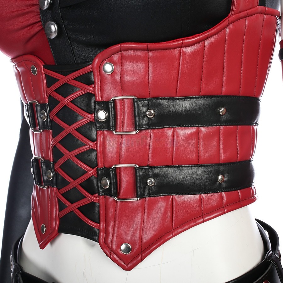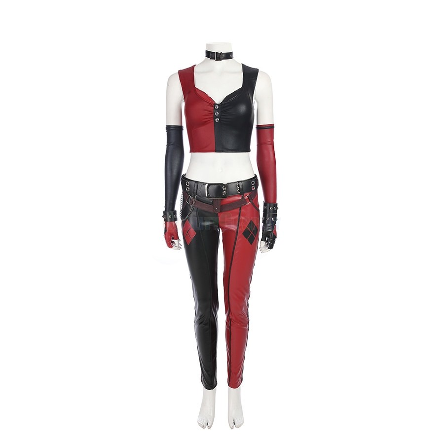 DetailsBatman: Arkham City Harley Quinn Cosplay Costume Sources:Batman: Arkham City Characters:Harley Quinn Material:Fabric: Faux Leather, Knitted Fabric Package Includes:Vest,Gloves,Pants,Choker,Belt,Top,Sleeve Protector,Wristbands