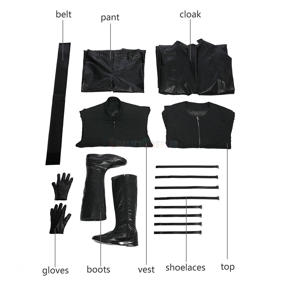 Package Includes: Cloak, Top, Pants, Belt, Gloves